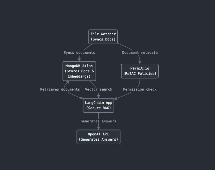 • Docker Compose: Orchestrates the services (MongoDB, Permit PDP, LangChain app, and file-watcher).